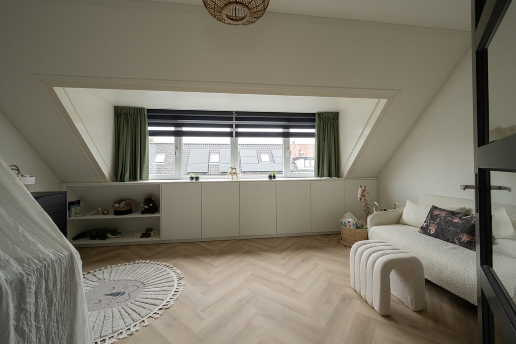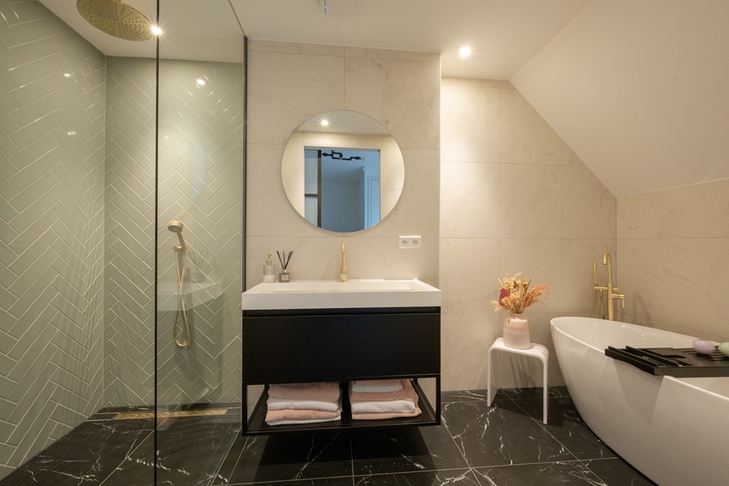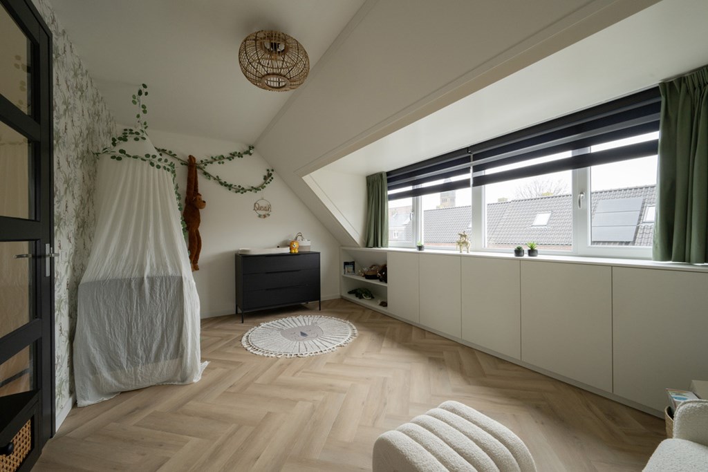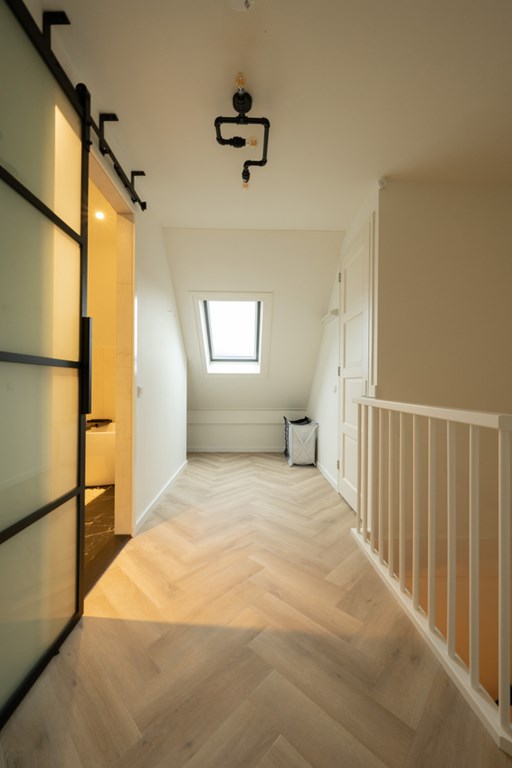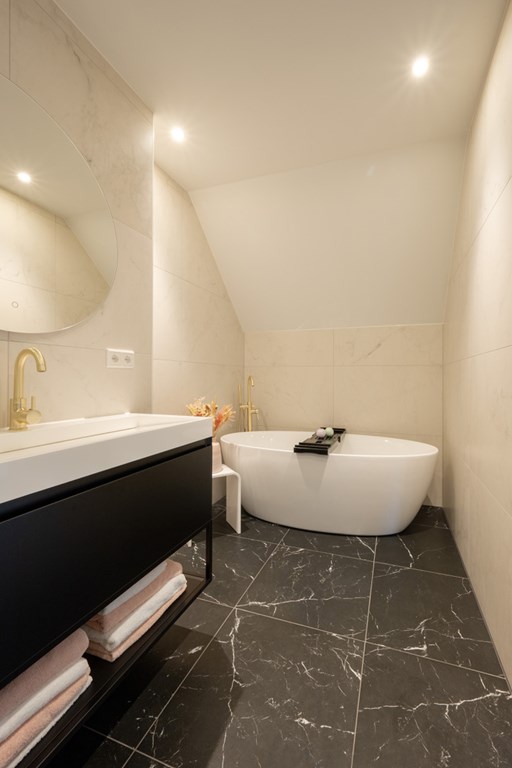 De tweede verdieping bestaat uit een royale derde slaapkamer (22 m2) met brede dakkapel aan de achterzijde. In de knieschotten is een ruime kast gerealiseerd met veel bergruimte. Daarnaast is hier een stijlvolle tweede badkamer met vloerverwarming aanwezig. Net als de andere badkamer is deze stijlvol afgewerkt en uitgerust met een wastafelmeubel, een vrijstaand ligbad en een inloop (regen)douche. Op de overloop zijn de CV-opstelling, WTW-installatie en de witgoedaansluitingen netjes weggewerkt in separate ruimte. Dankzij het dakraam en de kunststof dakkapel is deze verdieping royaal en licht.