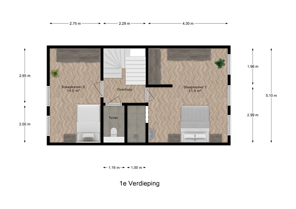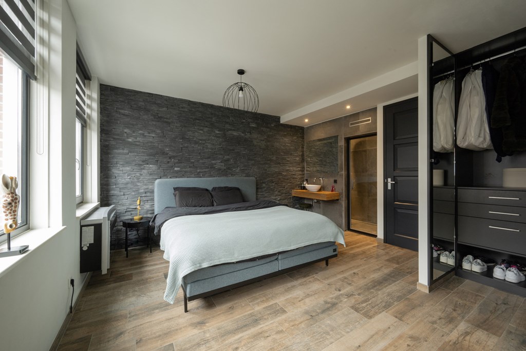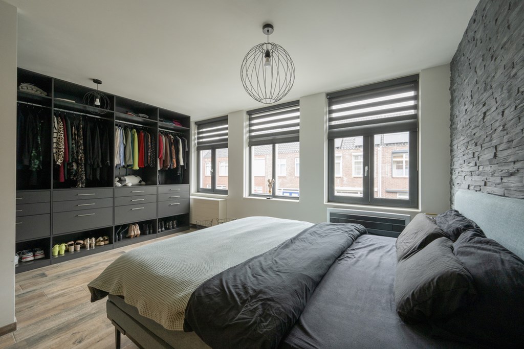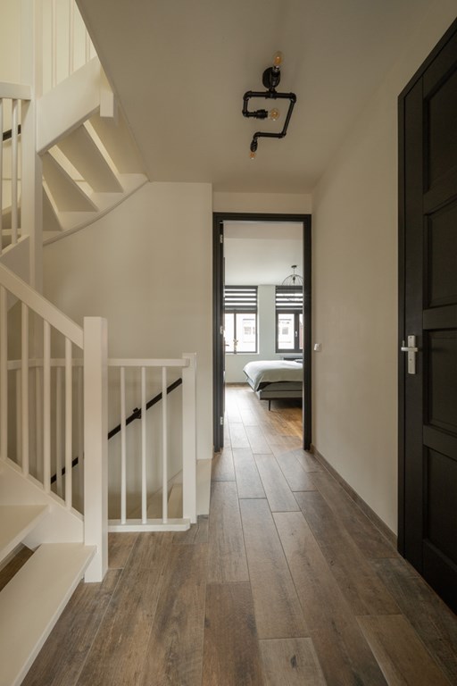 Op de eerste verdieping bevinden zich twee flinke slaapkamers. De master bedroom van maar liefst 22 m2 is hotel-chic afgewerkt met een airconditioning en een vaste kastenwand. Vanuit deze slaapkamer is direct toegang tot de prachtige badkamer, die is uitgevoerd met een inloop (regen)douche en een wastafelmeubel. De tweede slaapkamer (14 m2) ligt aan de voorzijde en is geschikt als slaap-, werk- of kinderkamer. Op de overloop bevindt zich een separaat toilet. Ook deze verdieping is keurig afgewerkt met een tegelvloer.