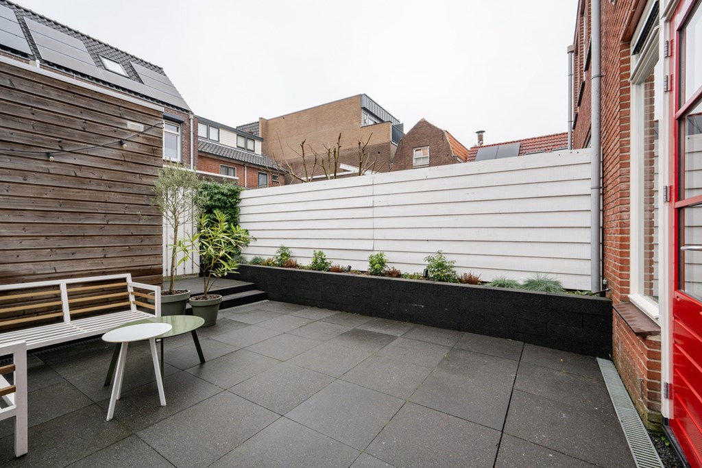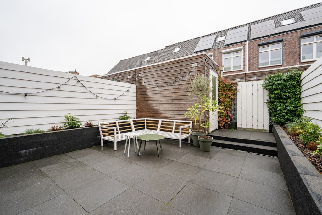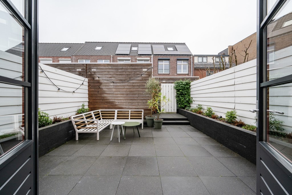 De achtertuin is aangelegd als onderhoudsvriendelijke stadstuin en beschikt over een terras, vaste plantenbakken en voldoende privacy. Achterin de tuin staat een vrijstaande houten berging van circa 6 m². De tuin is tevens bereikbaar via een achterom.